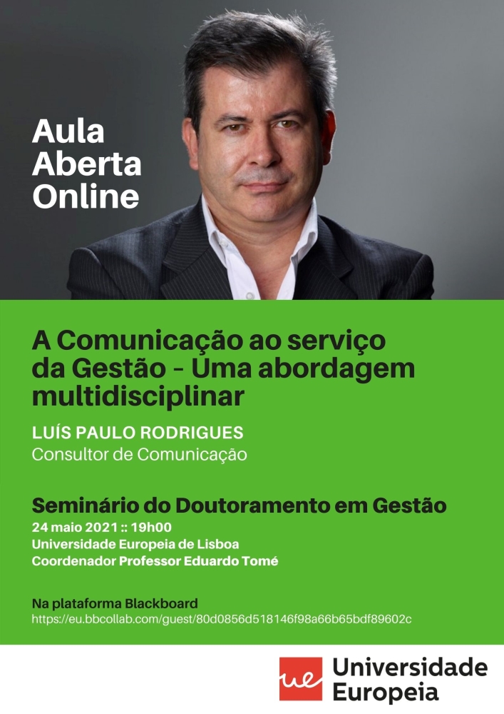 Esta segunda-feira, 24 de maio, pelas 19h00, estarei em videoconferência com os alunos do doutoramento em Gestão da Universidade Europeia, de Lisboa, do professor Eduardo Tomé, a quem irei falar sobre o papel da comunicação na gestão das organizações. Estão todos convidados e podem entrar na sala clicando no link: https://bit.ly/3uf3j8u.